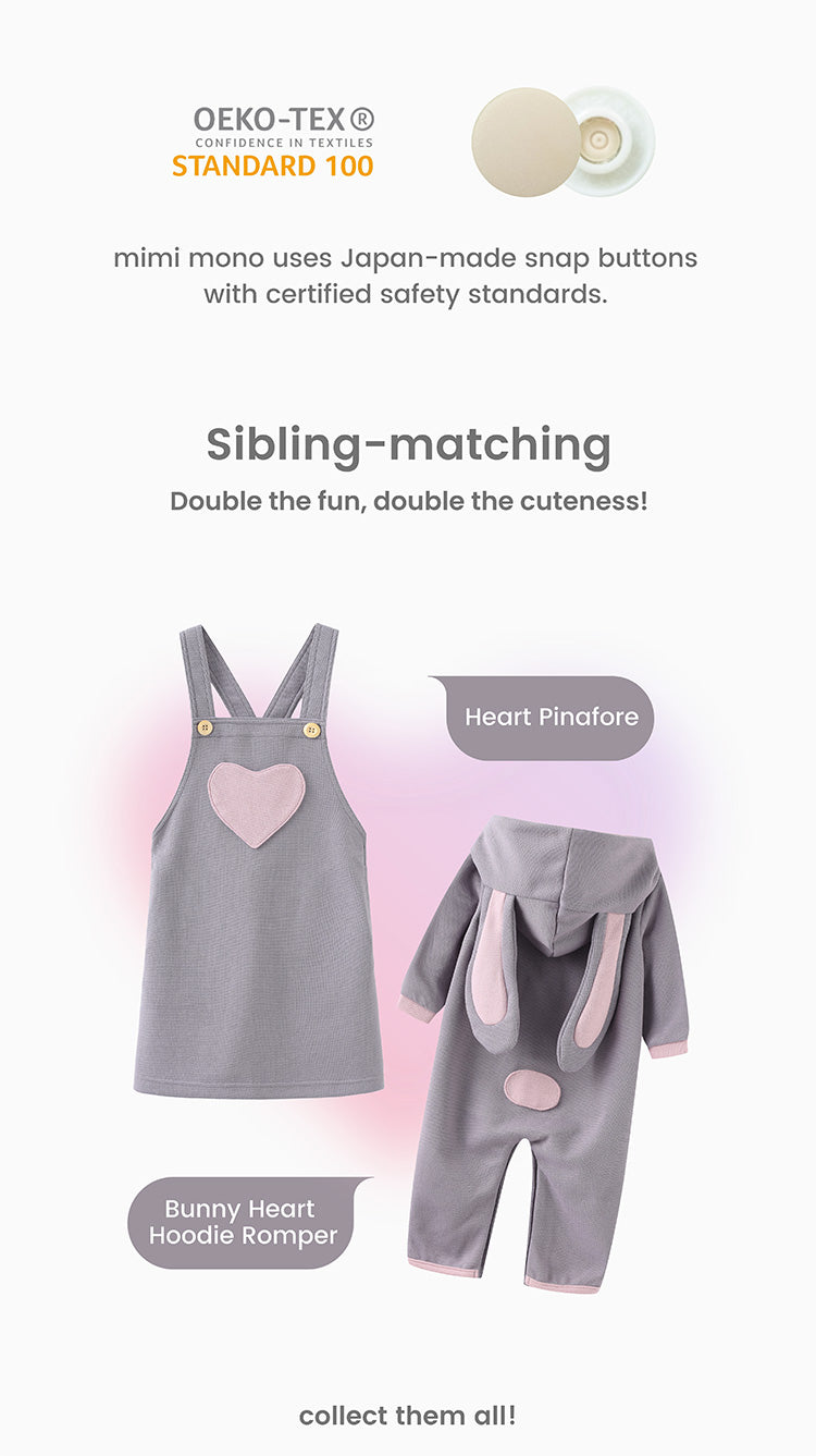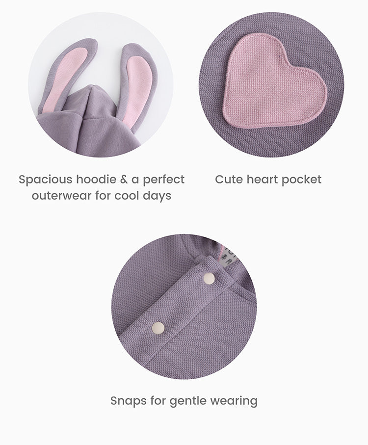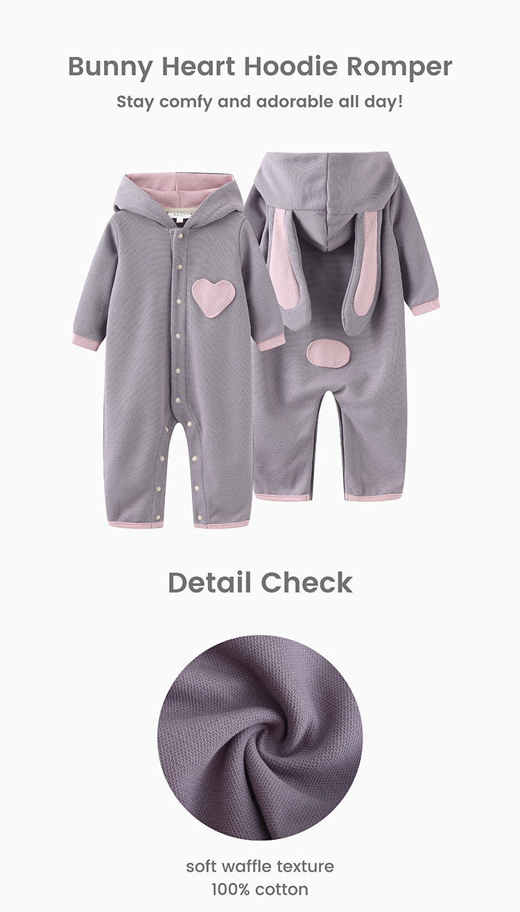 バニー ロンパーのご紹介: 着替えが簡単なフルボタンダウン、3D のバニー耳、柔らかいワッフルの質感、胸にハート型のミニポケットが付いた、涼しい日に最適なアウターウェアです。女の子用エプロンと合わせて完璧なルックに!