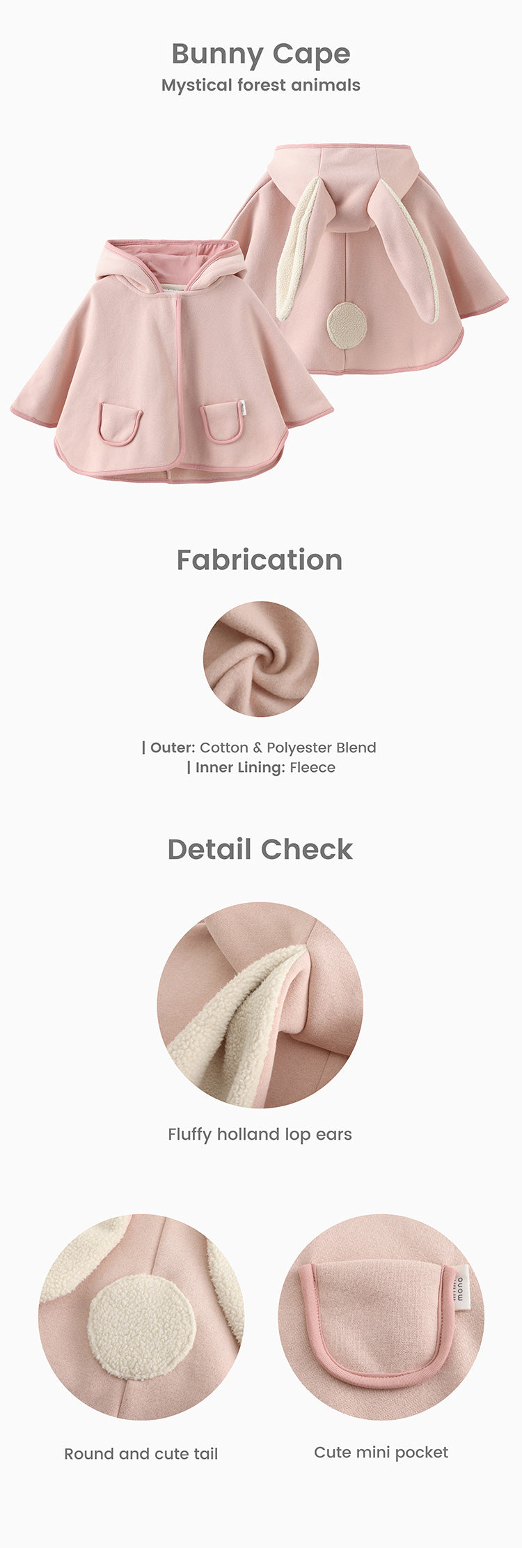 With adorable bunny ears on its hood, pretend play is upgraded! The contrasting mauve cotton piping complements to a pop of style. This cape is best worn with an inner layer during colder winter seasons.